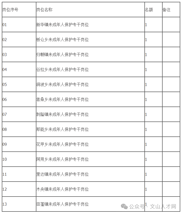 各乡(镇)未成年人保护专干各1名,共计13名。具体岗位见附件1。